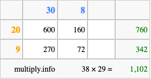 Below is an illustration showing you how to calculate 38 times 29 using the box method, using the instructions above.