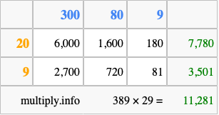 That's all there is to it! As you can see from the box above, the answer to 389 times 29 using the box method is 11,281.