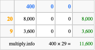 That's all there is to it! As you can see from the box above, the answer to 400 times 29 using the box method is 11,600.