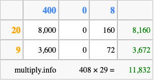 That's all there is to it! As you can see from the box above, the answer to 408 times 29 using the box method is 11,832.