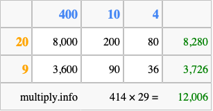 Below is an illustration showing you how to calculate 414 times 29 using the box method, using the instructions above.