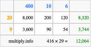 Below is an illustration showing you how to calculate 416 times 29 using the box method, using the instructions above.