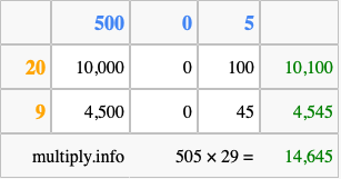 Below is an illustration showing you how to calculate 505 times 29 using the box method, using the instructions above.