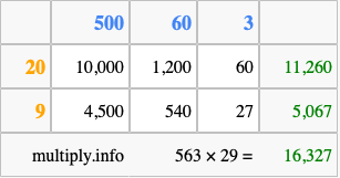That's all there is to it! As you can see from the box above, the answer to 563 times 29 using the box method is 16,327.