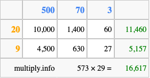 That's all there is to it! As you can see from the box above, the answer to 573 times 29 using the box method is 16,617.