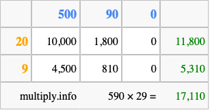 Below is an illustration showing you how to calculate 590 times 29 using the box method, using the instructions above.