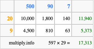 Finally, we add up all the sums we found in step 3 to get our final answer to 597 times 29.