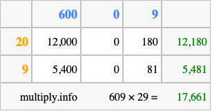 That's all there is to it! As you can see from the box above, the answer to 609 times 29 using the box method is 17,661.