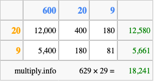 Finally, we add up all the sums we found in step 3 to get our final answer to 629 times 29.