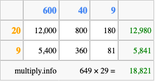 That's all there is to it! As you can see from the box above, the answer to 649 times 29 using the box method is 18,821.