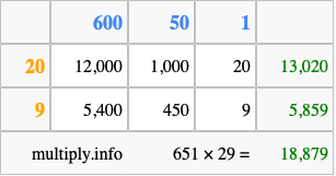 Below is an illustration showing you how to calculate 651 times 29 using the box method, using the instructions above.