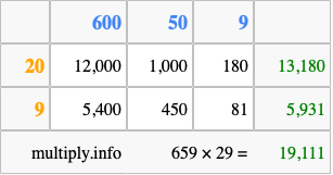 That's all there is to it! As you can see from the box above, the answer to 659 times 29 using the box method is 19,111.