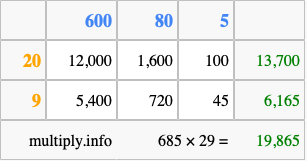 Below is an illustration showing you how to calculate 685 times 29 using the box method, using the instructions above.