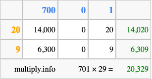 Below is an illustration showing you how to calculate 701 times 29 using the box method, using the instructions above.