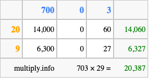 That's all there is to it! As you can see from the box above, the answer to 703 times 29 using the box method is 20,387.