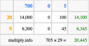Finally, we add up all the sums we found in step 3 to get our final answer to 705 times 29.