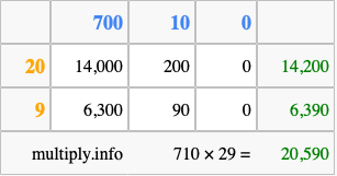 Below is an illustration showing you how to calculate 710 times 29 using the box method, using the instructions above.