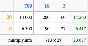 Below is an illustration showing you how to calculate 713 times 29 using the box method, using the instructions above.