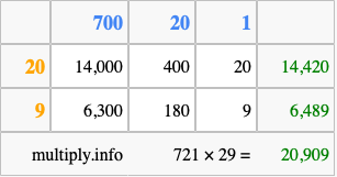 Finally, we add up all the sums we found in step 3 to get our final answer to 721 times 29.