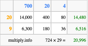 Finally, we add up all the sums we found in step 3 to get our final answer to 724 times 29.
