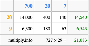 Finally, we add up all the sums we found in step 3 to get our final answer to 727 times 29.