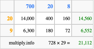 Below is an illustration showing you how to calculate 728 times 29 using the box method, using the instructions above.