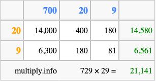 That's all there is to it! As you can see from the box above, the answer to 729 times 29 using the box method is 21,141.
