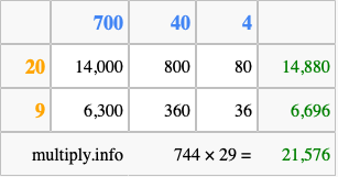 Finally, we add up all the sums we found in step 3 to get our final answer to 744 times 29.
