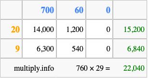 Below is an illustration showing you how to calculate 760 times 29 using the box method, using the instructions above.