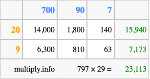 Finally, we add up all the sums we found in step 3 to get our final answer to 797 times 29.