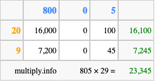 Finally, we add up all the sums we found in step 3 to get our final answer to 805 times 29.