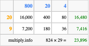 Finally, we add up all the sums we found in step 3 to get our final answer to 824 times 29.