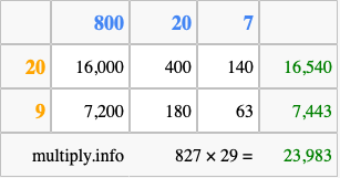 Finally, we add up all the sums we found in step 3 to get our final answer to 827 times 29.