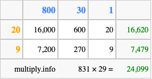 Below is an illustration showing you how to calculate 831 times 29 using the box method, using the instructions above.