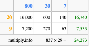 That's all there is to it! As you can see from the box above, the answer to 837 times 29 using the box method is 24,273.