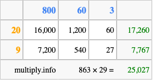 Finally, we add up all the sums we found in step 3 to get our final answer to 863 times 29.