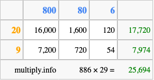Finally, we add up all the sums we found in step 3 to get our final answer to 886 times 29.