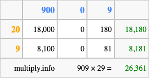 That's all there is to it! As you can see from the box above, the answer to 909 times 29 using the box method is 26,361.