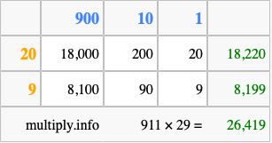 That's all there is to it! As you can see from the box above, the answer to 911 times 29 using the box method is 26,419.
