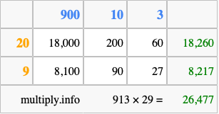 Below is an illustration showing you how to calculate 913 times 29 using the box method, using the instructions above.
