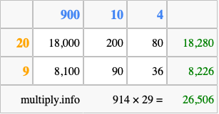 That's all there is to it! As you can see from the box above, the answer to 914 times 29 using the box method is 26,506.