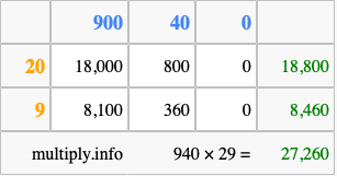 Finally, we add up all the sums we found in step 3 to get our final answer to 940 times 29.