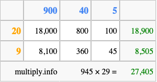 That's all there is to it! As you can see from the box above, the answer to 945 times 29 using the box method is 27,405.