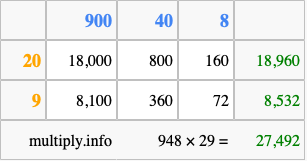 That's all there is to it! As you can see from the box above, the answer to 948 times 29 using the box method is 27,492.