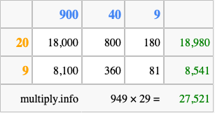 That's all there is to it! As you can see from the box above, the answer to 949 times 29 using the box method is 27,521.