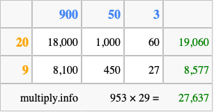 Finally, we add up all the sums we found in step 3 to get our final answer to 953 times 29.