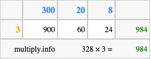 That's all there is to it! As you can see from the box above, the answer to 328 times 3 using the box method is 984.