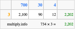 That's all there is to it! As you can see from the box above, the answer to 734 times 3 using the box method is 2,202.