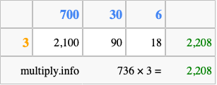 Below is an illustration showing you how to calculate 736 times 3 using the box method, using the instructions above.