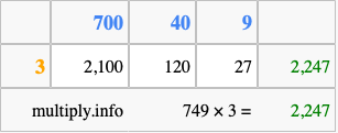 That's all there is to it! As you can see from the box above, the answer to 749 times 3 using the box method is 2,247.